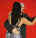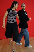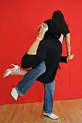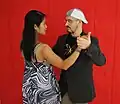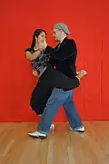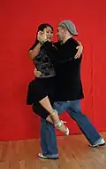 | Colgada | Colgada | Figura z wychyleniem ciała partnerki od osi, w której ciało kobiety jest odchylone do tyłu a partner podtrzymuje ją ramionami. Prosta wersja colgady może być zainicjalizowana przy przejściu partnerki wokół nogi partnera. Inne warianty są bardziej złożone (patrz formy colgady): "wygięta colgada" (zdjęcie po lewej) – figura, w której biodra kobiety i jej klatka piersiowa są w tym samym pionie; "colgada wyprostowana" (zdjęcie po prawej) to figura, w której plecy i nogi są w tej samej linii. | ||