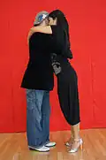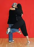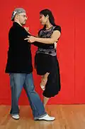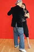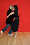 | Abrazo cerrado | Bliskie objęcie z otwartą stroną (przypominające literę V) | Tango salon i tango nuevo | Górna część ciała tancerzy jest bliżej do siebie niż ich biodra. W bliskim trzymaniu górna część ciała tancerzy jest w kontakcie, a ich czoła dotykają się, lub są bardzo blisko siebie. Zachowany jest dystans pomiędzy lewą stroną prowadzącego i prawą stroną prowadzonej, takie objęcie przypomina nieco literę V. | ![]() | |