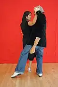 | Gancho nuevo | Partnerka umieszcza swoją nogę pomiędzy nogami partnera wyginając ją w formie haczyka. | |||