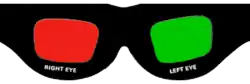 - Obraz anaglificzny – kombinacja na jednej kartce, zdjęciu lub filmie dwóch obrazów – czerwonego i zielonego (lub niebieskiego), po założeniu odpowiednich okularów, do każdego oka nie dociera jeden z obrazów, przez co zachodzi iluzja trójwymiarowości.