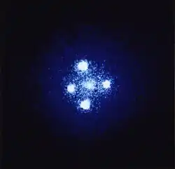 Na przykład przed ogólną teorią względności Alberta Einsteina obserwatorzy prawdopodobnie zinterpretowaliby zamieszczony obok obraz jako pięć różnych obiektów w przestrzeni. Jednak w świetle tej teorii astronomowie stwierdzą, że w rzeczywistości są to tylko dwa przedmioty – jeden pośrodku oraz cztery inne obrazy drugiego przedmiotu wokoło. Ewentualnie, inni naukowcy mogliby podejrzewać, że zawiódł teleskop i tak naprawdę został zaobserwowany tylko jeden obiekt, więc pracowaliby już nad inną teorią. Obserwacje, które nie mogą być oddzielone od teoretycznej interpretacji, nazywane są uwikłaniem lub obciążeniem teoretycznym[51].