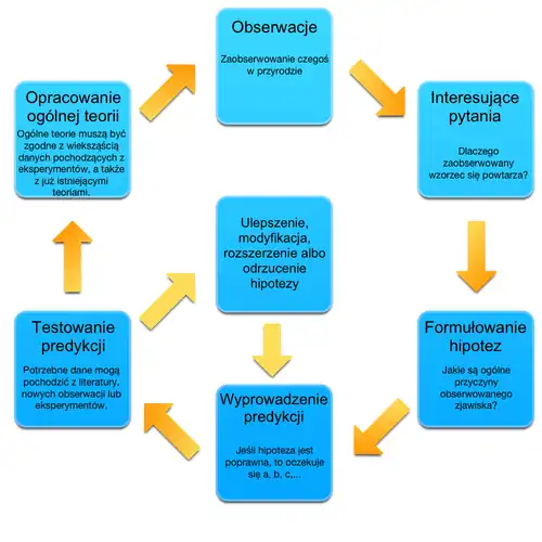Metoda naukowa to postępujący w czasie proces, który zaczyna się zazwyczaj od obserwacji świata naturalnego. Istoty ludzkie są naturalnie dociekliwe, więc często zadają sobie pytania na temat otaczających ich rzeczy i formułują pomysły (hipotezy) wyjaśniające dlaczego rzeczy te zachowują się tak, a nie inaczej. Z najlepszych hipotez można wyciągnąć predykcje (przepowiednie) o zachowaniu się rzeczy, których poprawność można sprawdzić w różnoraki sposób. Zasadniczo najbardziej rygorystyczne sprawdzenie hipotez odbywa się przy pomocy starannie kontrolowanego i powtarzalnego eksperymentu fizycznego. W zależności od zgodności wyniku eksperymentu z predykcją teoretyczną, hipoteza może potrzebować udoskonalenia, przebudowania lub rozszerzenia – może także zostać całkowicie odrzucona. Jeśli konkretna hipoteza posiada bardzo mocne potwierdzenie empiryczne, to może posłużyć jako podstawa w budowaniu ogólnej teorii naukowej[32].