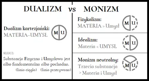 Początki dualizmu można odnaleźć już u Platona[6] albo na gruncie filozofii indyjskiej w szkołach Sankhji i Jogi[7]. Słynnym dualistą był Kartezjusz[8]. Dualiści substancjalni twierdzą, że istniejącą dwie niezależne substancje: „umysł” i „ciało”. Dualiści własności uważają natomiast, że umysł nie jest oddzielną substancją, lecz stanowi grupę niezależnych własności, które wyłoniły się z mózgu i nie mogą zostać do niego zredukowane[9].