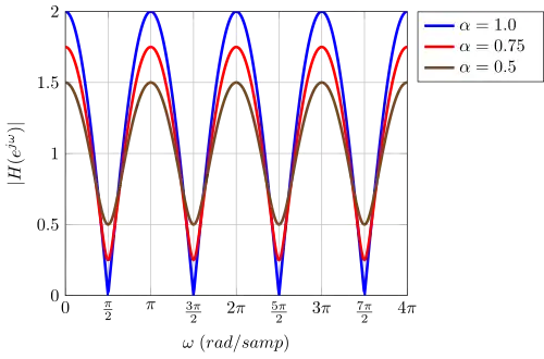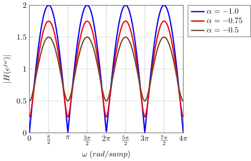 Dla sygnału o maksymalnej częstotliwości (połowa częstotliwości próbkowania, i.e. dwie próbki na okres) jego opóźnienie o próbki daje sygnał oryginalny, a zatem dla na wyjściu sumatora otrzyma się sygnał o dwukrotnie większej amplitudzie. Odpowiada to widocznemu maksimum charakterystyki dla