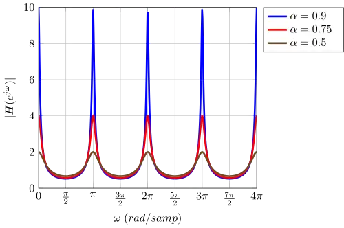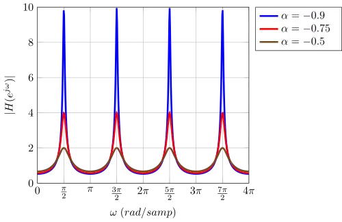 Na poniższym rysunku przedstawiono charakterystykę amplitudową filtru grzebieniowego dla i kilku wybranych wartości Jednostką osi odciętych jest znormalizowana częstotliwość (a zatem wartości odpowiada częstotliwość próbkowania sygnału dyskretnego, a wartości – częstotliwość Nyquista).