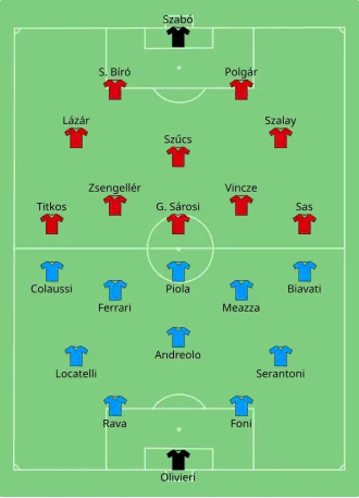| 2:1 (dogr.) | Pietro Ferraris, Silvio Piola[6] | 1/8 finału | 6:0 | Vilmos Kohut, Géza Toldi, György Sárosi ×2, Gyula Zsengellér ×2[7] | ||