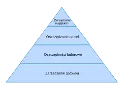 Utrzymanie płynności w budżecie domowym pozwala z czasem odłożyć część środków na różne nieprzewidzianie sytuacje (tzw. poduszka lub bufor oszczędności). Zgromadzenie rezerwy finansowej ułatwia utrzymanie płynności, a jednocześnie pozwala zainicjować zachowania związane z kumulowaniem oszczędności, co jest warunkiem przejścia na kolejny poziom, czyli systematycznego oszczędzania na różne cele (w tym cele bardzo odległe czasowo – takie jak np. edukacja dzieci, zabezpieczenie emerytalne). Ostatnim poziomem piramidy jest pozycja rentiera żyjącego z dochodów z wypracowanego i pomnożonego majątku[3].