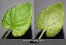 - Posiada wyłącznie liście odziomkowe[6]. Blaszka liściowa jest żółtawozielona i ma owalny kształt. Mierzy 6–20 mm długości oraz 5–18 mm szerokości, jest ząbkowana na brzegu, ma sercowatą nasadę z dużą zatoką i ostry lub tępy wierzchołek[6][7]. Ogonek liściowy jest nagi[7]. Przylistki są silnie owłosione, frędzlowate[6].