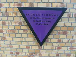 Fioletowy trójkąt był jednym z symboli systemu oznakowania więźniów w niemieckich nazistowskich obozach koncentracyjnych[13]. Był używany w III Rzeszy do oznaczania osadzonych w obozach Świadków Jehowy[b][14]. W zamierzeniu nazistów fioletowy trójkąt miał być piętnem i powodem do wstydu. Jednak dla Świadków Jehowy ten symbol stał się zarówno ważnym znakiem rozpoznawczym, jak też wyróżnikiem ich wiary. Dzięki niemu Świadkowie szybko siebie rozpoznawali, a więźniom dawał poczucie przynależności do grupy. Graficzny znak jakim był fioletowy trójkąt wykraczał poza granice narodowościowe i etniczne, dlatego bez względu na istniejące różnice językowe lub kulturowe akceptowano poszczególnych więźniów różnych narodowości i dbano o siebie nawzajem[15]. Po II wojnie światowej znak fioletowego trójkąta stał się symbolem upamiętniania Świadków Jehowy jako ofiar holocaustu[16][17].