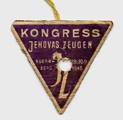 Podczas kongresów pod hasłem „Weselące się narody” zorganizowanych przez Świadków Jehowy w 1946 roku, ich uczestnicy nosili plakietki dla delegatów w kształcie fioletowego trójkąta wzorowane na oznakowaniu Świadków Jehowy w obozach koncentracyjnych. Miały one na celu przypomnienie prześladowań jakie członkowie tej grupy religijnej przeszli pod rządami nazistów. W Polsce takie plakietki nosiło przeszło 7000 uczestników ogólnokrajowego kongresu pod hasłem „Chwalcie Jehowę wszystkie narody”, który się odbył 25 i 26 maja 1947 roku w Krakowie[23] oraz uczestnicy kongresów, które odbyły się w tym samym roku m.in. w Sopocie i Warszawie, a w 1948 roku w Chrzanowie[24][25].