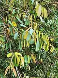 - Mają kształt od podłużnego do eliptycznie odwrotnie jajowatego. Mierzą 6–13 cm długości oraz 2–5 cm szerokości. Są skórzaste, mniej lub bardziej owłosione od spodu. Nasada liścia jest od zaokrąglonej do klinowej. Blaszka liściowa jest o ostrym lub zaokrąglonym wierzchołku. Ogonek liściowy jest owłosiony i dorasta do 10 mm długości[5][6].