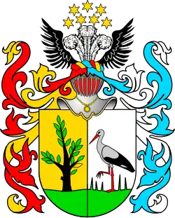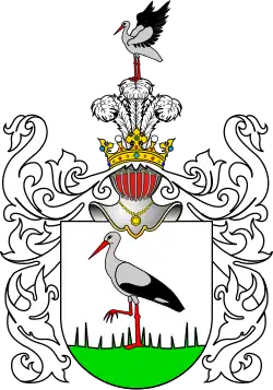 Na tarczy dzielonej w słup w polu prawym, złotym, na murawie zielonej - drzewo; w polu lewym, srebrnym, na murawie zielonej, bocian naturalny. W klejnocie, nad hełmem w zawoju czerwono-złoto-błękitnym, trzy pióra strusie, nad którymi siedem gwiazd złotych (3 i 4), całość między dwoma skrzydłami orlimi czarnymi. Labry z prawej czerwone, podbite złotem, z lewej błękitne, podbite srebrem.