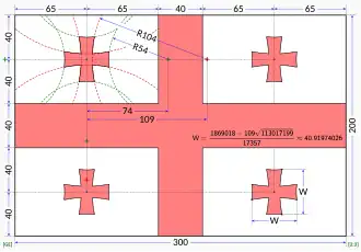 Flaga złożona z pięciu czerwonych krzyży na białym tle, z czerwonym krzyżem św. Jerzego w centrum flagi i czterema po bokach |