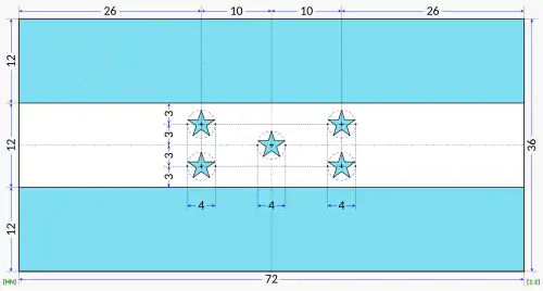 3 poziome pasy, niebieski, biały i niebieski, 5 niebieskich gwiazd na białym pasie |