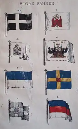 - ↑ Rīgas karoga vēsture – Rīgas pilsētas būvvalde [online], web.archive.org, 2 czerwca 2021 [dostęp 2023-04-07] [zarchiwizowane z adresu 2021-06-02].
