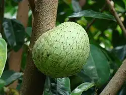 - Tworzą owoc zbiorowy. Mają jajowaty lub prawie kulisty kształt. Osiągają 9,5–14 cm długości oraz 9,5–14 cm średnicy. Powierzchnia jest zielona z miękkimi i ciemnobrązowymi kolcami oraz kilkoma brązowymi włosami. Owocnia ma żółtawą barwę i jest aromatyczna[6].