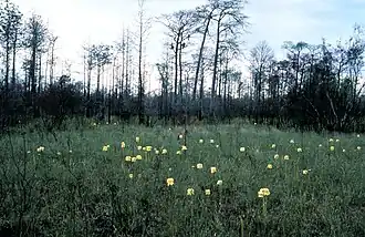 Wśród rosnących w tym ekosystemie roślin zielnych wymienić można: storczykowate: Pogonia ophioglossoides i z rodzaju Calopogon, przygiełki (Rhynchospora) i owadożerne kapturnice (Sarracenia)[5].