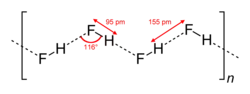 Fluorowodór w stanie stałym tworzy zygzakowate łańcuchy cząsteczek – asocjat HF. Cząsteczki HF o wewnętrznych wiązaniach H-F o długości 0,95 Å, są połączone wiązaniami wodorowymi H···F o długości 1,55 Å Ciekły HF również tworzy zygzakowate łańcuchy, tyle że krótsze, zawierające średnio pięć do sześciu połączonych cząsteczek. Wyższa temperatura topnienia HF niż innych fluorowcowodorów jest spowodowana silnymi wiązaniami wodorowymi pomiędzy cząsteczkami. HF posiada moment dipolowy.