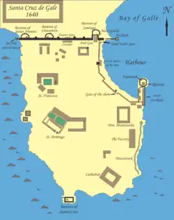 W 1505 roku flota portugalska dowodzona przez Dona Laurenco de Almeidę, zmierzająca na Malediwy, zatrzymała się w porcie Galle w celu przeczekania niekorzystnych warunków atmosferycznych. Od tego momentu Galle zaczęło pełnić rolę regularnego portu zawinięć jednostek portugalskich. Do 1588 roku Portugalczycy nie podjęli jednak budowy żadnych umocnień obronnych. Jedyną wzniesioną do tego czasu konstrukcją była Kaplica Franciszkańska, zbudowana w 1543 roku[6].