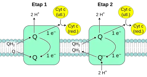 Ze względu na możliwość przeniesienia tylko jednego elektronu z cząsteczki QH2 na cytochrom c, reakcje zachodzące na kompleksie III są bardziej złożone niż reakcje na pozostałych kompleksach i zachodzą w dwóch etapach nazywanych cyklem Q[35]. W pierwszym etapie z kompleksem związane są trzy substraty, utleniana cząsteczka QH2, cytochrom c oraz cząsteczka ubichinonu. Jeden z elektronów pobranych z ubichinolu przekazywany jest na cytochrom c. Drugi elektron przekazywany jest do cząsteczki ubichinonu przyłączonej po stronie macierzy mitochondrialnej. Protony powstające po pobraniu elektronów z cząsteczki QH2 uwalniane są do przestrzeni międzybłonowej. Cząsteczka ubichinonu redukowana po przeciwnej stronie kompleksu przyłącza protony z macierzy mitochondrialnej. Po odebraniu elektronów z ubichinolu odłącza się on od kompleksu. To samo dzieje się ze zredukowanym cytochromem c. Druga cząsteczka ubichinonu, na którą został przeniesiony jeden elektron, tworzy semichinon i pozostaje związana z kompleksem. W drugim etapie do enzymu przyłączona zostaje następna cząsteczka QH2 i po raz kolejny jeden z elektronów przenoszony jest na cytochrom c a drugi na związaną cząsteczkę semichinonu. W efekcie semichinon zostaje zredukowany do QH2, a dwa dodatkowe protony pobrane z macierzy mitochondrialnej. Powstała cząsteczka QH2 odrywa się od kompleksu i może zostać utleniona w części utleniającej enzymu[36].
