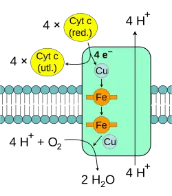 Enzym katalizuje końcową reakcje łańcucha oddechowego, przenosząc elektrony na tlen i jednocześnie przemieszczając protony przez błonę[39]. Tlen po przyjęciu elektronów ulega redukcji, przyłączając protony z macierzy mitochondrialnej, co prowadzi do powstania wody. Zarówno przenoszenie protonów w poprzek błony, jak i zużywanie, po stronie macierzy mitochondrialnej w reakcji powstawania wody, prowadzi do zwiększenia gradientu protonowego. Reakcja katalizowana polega na utlenianiu cytochromu c i redukcji tlenu według równania: