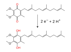 W wewnętrznej błonie mitochondrialnej lipofilny przenośnik elektronów, koenzym Q10 (Q), przenosi zarówno elektrony, jak protony, dzięki cyklicznej redukcji i utlenianiu[8]. Mała cząsteczka benzochinonu, o silnie hydrofobowym charakterze może swobodnie dyfundować w błonie. Po przyjęciu dwóch elektronów i dwóch protonów ubichinon przekształca się w formę zredukowaną – ubichinol (QH2). Gdy QH2 podczas utleniania przekazuje dwa elektrony i uwalnia dwa protony, powraca do swojej formy utlenionej – ubichononu. W efekcie, dzięki lokalizacji miejsca redukcji Q po jednej stronie błony, a miejsca utleniania QH2 po drugiej, ubichinon bierze udział w przenoszeniu protonów przez błonę[9]. U części bakterii poza ubichinonem w łańcuchu transportu elektronów uczestniczą inne chinony, na przykład menachinon[10].