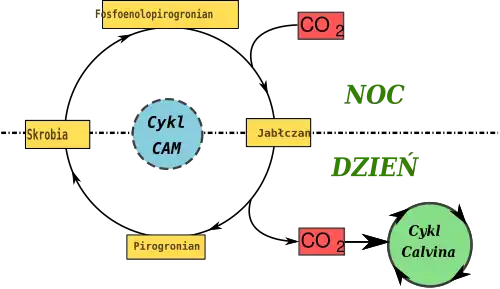 U roślin z rodziny gruboszowatych (Crassulaceae), wykryto po raz pierwszy specyficzny przebieg fotosyntezy, nazwany fotosyntezą CAM ((ang.) Crassulacean Acid Metabolism) – kwasowy metabolizm węgla gruboszowatych. Proces ten zachodzi także np. u ananasów i licznych sukulentów z różnych rodzin botanicznych, a także roślin zasiedlających kwaśne wody, np. jeziora lobeliowe. Rośliny te w dzień zamykają szparki, przez co wymiana gazowa jest ograniczona, a woda zatrzymywana w tkankach, natomiast w nocy otwierają je, a pochłonięty CO2 jest przyłączany do fosfoenolopirogronianu (podobnie jak u roślin C4), w wyniku czego tworzy się jabłczan, który magazynowany jest w wakuoli. W ciągu dnia, gdy rośliny mogą wykorzystywać energię światła słonecznego w fazie jasnej fotosyntezy, pochodzący z rozkładu jabłczanu CO2 zasila cykl Calvina. Przez to roślina może prowadzić fotosyntezę przy zamkniętych aparatach szparkowych[39].