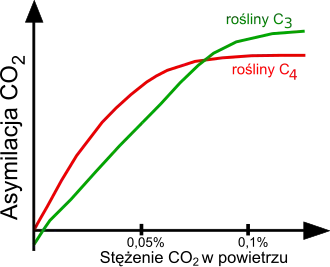Stężenie dwutlenku węgla w powietrzu wynoszące około 0,036% jest znacznie niższe niż optymalne dla procesu fotosyntezy przy sprzyjających warunkach świetlnych i odpowiedniej temperaturze. W optymalnych warunkach natężenie fotosyntezy wzrasta aż do stężenia CO2 około 0,1%. Przy wyjątkowo niskich stężeniach CO2 procesy oddychania i fotooddychania wytwarzają więcej CO2 niż jest asymilowane w fotosyntezie. Stężenie CO2, przy którym jego wydzielanie równoważy się z fotosyntetycznym pobieraniem, nosi nazwę punkt kompensacyjny stężenia dwutlenku węgla. Dla roślin o fotosyntezie C4 jest on bliski zeru, a dla roślin o fotosyntezie C3 zależnie od gatunku i temperatury leży on w przedziale 0,009–0,018% CO2. Natężenie fotosyntezy dla roślin C4 jest przy niskich stężeniach dwutlenku węgla wyższe niż dla roślin C3. Przy wartościach bliskich stężeniu optymalnemu rośliny C3 uzyskują niewielką przewagę w intensywności wiązania CO2, co wykorzystuje się to w uprawach szklarniowych poprzez „nawożenie” roślin CO2 w sprzyjających warunkach temperaturowych i świetlnych. Stężenia CO2 powyżej 1% są dla roślin toksyczne i powodują zahamowanie procesy fotosyntezy[81][82]. Badania na zielenicy Chlorella vulgaris nie wykazały, aby stężenie do 4% wpływało na aktywność RuBisCO, choć wpływało na niektóre inne enzymy biorące udział w metabolizmie węgla (jak anhydraza węglanowa czy karboksylaza PEP)[18].