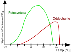 Jak dla wszystkich procesów przeprowadzanych z użyciem enzymów, tak i dla fotosyntezy temperatura jest czynnikiem ograniczającym. Rośliny są w stanie przeprowadzać fotosyntezę w temperaturach niewiele poniżej zera (rośliny górskie) aż do temperatur zbliżających się do 50 °C (rośliny pustyń). Nieco szerszy zakres tolerancji wykazują glony, zwłaszcza sinice. Eukariotyczne glony są w stanie żyć i fotosyntetyzować do temperatury 55–60 °C, choć dla większości gatunków granica ta sięga zaledwie do 40 °C. Termofilne gatunki sinic przeprowadzają fotosyntezę do ok. 75 °C w wodach obojętnych lub zasadowych i ok. 56 °C w wodach kwaśnych[91]. Przy optymalnych warunkach świetlnych optimum temperaturowe wynosi około 30 °C[92] i jest niższe dla roślin C3 niż dla roślin C4[93]. Przy wyższych temperaturach natężenie fotosyntezy spada, co jest związane przede wszystkim ze wzrastającą intensywnością reakcji oddychania i fotooddychania w temperaturach powyżej 40 °C. W temperaturze powyżej 40 °C spada powinowactwo enzymu RuBisCO do CO2, przez co większego znaczenia nabiera druga funkcja tego enzymy – oksydacja 1,5-bisfosforybulozy. W temperaturze 60–70 °C dochodzi do denaturacji kompleksów chlorofilowo-białkowych, co prowadzi do całkowitego zaniku aktywności fotosyntetycznej rośliny. Zmiana właściwości enzymów biorących udział w reakcjach fotosyntezy to niejedyna przyczyna zmian w natężeniu fotosyntezy. Wraz ze wzrostem temperatury zwiększa się płynność błon komórkowych, co prowadzi do wycieku jonów, między innymi protonów, z wnętrza tylakoidów. W efekcie pomimo transportu elektronów przez przenośniki nie jest wytwarzany gradient protonowy niezbędny do syntazy ATP. W niskich temperaturach płynność błon komórkowych ulega zmniejszeniu, co ogranicza tempo dyfuzji ruchliwych przenośników elektronów, głównie plastochinonu i plastocyjaniny, a w konsekwencji obniża wydajność fazy jasnej fotosyntezy[94]. Wrażliwość na fotooksydację wzrasta wraz z temperaturą, przez co postuluje się, że duże natlenienie wód po letnich zakwitach jest wraz z wysoką temperaturą przyczyną śmierci skądinąd ciepłolubnych gatunków sinic[18]. Dla niektórych termofilnych sinic optymalna temperatura fotosyntezy wynosi 68–72 °C, podczas gdy dla gatunków umiarkowanie termofilnych – 45–50 °C. Z kolei niektóre kriofilne szczepy zielenicy zawłotni śnieżnej Chlamydomonas nivalis optymalnie fotosyntetyzują przy temperaturze 3 °C (choć dla innych szczepów tego gatunku to może być nawet 20 °C)[91]. U niektórych organizmów temperatura może modyfikować dominujący typ fotosyntezy. Chlorella vulgaris w temperaturze ok. 25 °C przeprowadza cykl Hatcha-Slacka, natomiast w temperaturze niższej lub wyższej – typ C3[18].