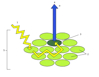 Zamiana energii światła na energię wiązań chemicznych jest możliwa dzięki absorpcji kwantów światła (fotonów) przez chlorofil. Cząsteczka tego barwnika może absorbować zarówno kwant światła czerwonego (λmaks = 634 nm), przechodząc ze stanu podstawowego (trypletowego) do pierwszego stanu wzbudzonego (pierwszego stanu singletowego), jak i kwant światła niebieskiego, przechodząc ze stanu podstawowego do drugiego stanu wzbudzonego (drugiego stanu singletowego). Drugi stan wzbudzenia jest wyjątkowo nietrwały, cząsteczka chlorofilu szybko przechodzi do pierwszego stanu wzbudzenia, rozpraszając różnicę energii między stanami. Energia pierwszego stanu wzbudzenia może być przekazana poprzez kolejne cząsteczki chlorofilu układu antenowego do centrum reakcji fotoukładu, wybijając z niego elektron. Energia wzbudzonego chlorofilu może być też wyemitowana jako kwant światła, co obserwuje się jako czerwone promieniowanie fluorescencyjne[11] w postaci ciepła. Jego część może być ponownie wykorzystana do fotosyntezy[12].