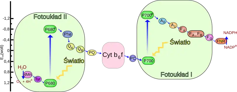 Energia kwantów światła przekazana do centrum reakcji fotoukładu II powoduje wybicie elektronu[20]. Elektron jest przekazywany przez cząsteczkę feofityny, a następnie poprzez cząsteczki plastochinonu połączone z białkami na wolny plastochinol. Powstały wskutek redukcji plastochinonu, plastochinol przemieszcza się w błonie tylakoidu, na drodze dyfuzji, do kompleksu cytochromowego b6f. W obrębie kompleksu cytochromowego b6f zachodzi cykl Q, w wyniku którego dodatkowe protony H+ przemieszczane są ze stromy chloroplastów do wnętrza tylakoidów. Kompleks cytochromowy b6f przekazuje elektron na niewielkie białko zawierające miedź – plastocyjaninę. Odbiorcą elektronów od plastocyjaniny jest fotoukład I[21], po uprzednim wybiciu elektronów z centrum reakcji. Wybicie elektronu z centrum reakcji fotoukładu I odbywa się poprzez wzbudzenie cząsteczki chlorofilu. Elektron wybity z centrum reakcji fotoukładu I przekazywany jest na cząsteczkę NADP+, która staje się formą zredukowaną NADPH. W przekazaniu elektronu na cząsteczkę NADP+ bierze udział kilka przekaźników, między innymi cząsteczka witaminy K (filochinon) oraz ferredoksyna. Miejsce po elektronie oderwanym z centrum reakcji fotoukładu II zapełniane jest przez elektron oderwany z wody. Reakcja ta jest przeprowadzana przez kompleks rozkładający wodę[22][23]. Po oderwaniu 4 elektronów następuje rozszczepienie 2 cząsteczek wody na 4 protony i cząsteczkę tlenu[24]. W wyniku uwalniania protonów z rozkładu wody wewnątrz tylakoidu (lumenie), pobierania protonów podczas redukcji NADP+ w stromie chloroplastu oraz transportu protonów w cyklu Q, ze stromy do wnętrza tylakoidu, powstaje gradient protonowy – różnica stężeń protonów na zewnątrz i wewnątrz tylakoidu. Gradient protonowy jest wykorzystywany przez kompleks syntazy ATP do wytwarzania drugiego produktu fazy jasnej – ATP[25]. Opisany szlak wędrówki elektronów z cząsteczki wody na cząsteczkę NADP+ określa się jako fosforylację niecykliczną[26][27].