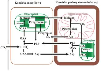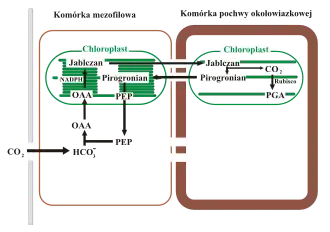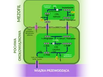 Proces wiązania CO2 zachodzi dwukrotnie. Po wniknięciu do komórek mezofilu przez aparaty szparkowe, CO2 przyłączany jest do fosfoenolopirogronianu. W reakcji tej powstaje związek czterowęglowy – szczawiooctan. Jest on w zależności od gatunku rośliny przekształcany do asparaginianu lub jabłczanu i w tej postaci przenoszony do komórek pochew okołowiązkowych. Tam zachodzi reakcja dekarboksylacji i wydzielenie CO2, który jest włączany do cyklu Calvina-Bensona. Cykl ten zachodzi tylko w komórkach pochew okołowiązkowych, gdzie stężenie CO2 przekracza 10-20 razy stężenie CO2 w komórkach mezofilu.
