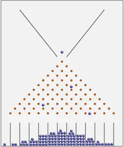 W celu wyjaśnienia losowych przyczyn powodujących zróżnicowanych cech, Galton wynalazł deskę, na której równomiernie nabito gwoździe tworzące trójkąt. Na szczycie jest wbity jeden gwóźdź, w następnym nabito dwa tak rozmieszczone, że gwóźdź z wyższego rzędu znajduje się nad środkiem liku pomiędzy dwoma nabitymi niżej. Na pochylonej desce upuszcza się kulki, których średnica była mniejsza niż odległość sąsiednich gwoździ. Kulki losowo wpadają do luk na lewo lub na prawo od gwoździa, a następnie spadały do jednego z rowków wyżłobionych na dole deski. Rozkład dużej liczby kulek pokrywa się z rozkładem normalnym. Wynalazek ten został później nazywany deską Galtona[3].