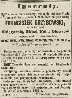 - ↑ Spis książek znajdujących się w Księgarni Fr. Grzybowskiego w Krakowie, Kraków 1865.
