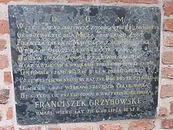 - ↑ Tablice epitafijne jego dziadków ze strony ojca: Franciszka Grzybowskiego (1759–1837) i Kunegundy z Orczykowskich vel Orczyk (1766–1831) znajdowały się w bazylice św. Floriana (obecnie w murze Cmentarza Rakowickiego (pas Lb)), zaś dziadków ze strony matki: Macieja Stroynego (1765–1826) i Teresy z Orubów (zm. 1836) w bazylice NMP na Piasku[3].