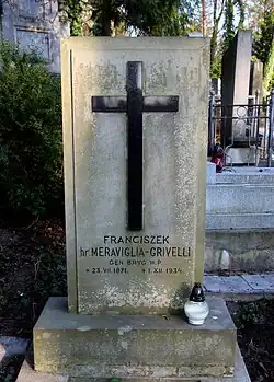 Franciszek Meraviglia-Crivelli został pochowany na Cmentarzu Łyczakowskim we Lwowie. Był żonaty z Heleną Sromenger, z którą miał syna Rudolfa Franciszka Józefa (ur. 30 sierpnia 1905), rotmistrza Wojska Polskiego i córkę Elżbietę (ur. 27 listopada 1915)[10][11]. Syn Rudolf 4 lipca 1931 we Lwowie ożenił się z Janiną z Borzemskich (1911–1949), siostrą Pawła Jerzego (1919–1945), porucznika 10 pułku strzelców konnych.