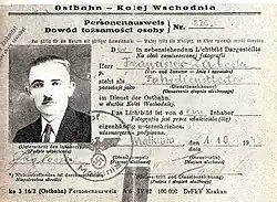 ![]() Franciszek Ząbecki (rozmawia przez telefon) w budynku stacji kolejowej w Treblince | |