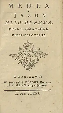 - Medea. Melodrama z muzyką, powst. około roku 1785, muzyka: G. Benda, rękopisy (kopie): Biblioteka Narodowa (BOZ sygn. 1000, pt. Medea i Jazon , melodrama z muzyką sławnego p. Bendy) i Ossolineum sygn. 7069/I (odpis L. Bernackiego), fragm. z aktu 1 scena 1 ogł. L. Bernacki jak wyżej poz. 8, s. 87-89, (według F. W. Gotter: Medea – przeróbka z P. Corneille: Médée. Tragédie)
