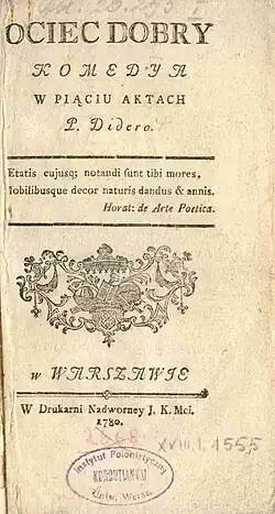 - Ociec dobry. Komedia w 5 aktach p. Diderot[11], Warszawa (VII 1780), wyst. Warszawa 17 stycznia 1782; wyd. bezimienne; (według D. Diderot: Le Père de famille)