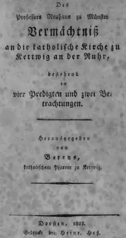 - Vermächtnis an die katholische Kirche zu Kettwig an der Ruhr, bestehend in 4 Predigten und 2 Betrachtungen, hg. von Berens (1823)