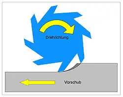 - przeciwbieżne - krawędź tnąca narzędzia porusza się przeciwnie do posuwu materiału. Przy tym rodzaju frezowania krawędź porusza się wzdłuż obrabianej powierzchni, będąc stopniowo coraz silniej do niej dociskaną. Na początku siła dociskająca jest tak mała, że krawędź narzędzia ślizga się po materiale, utwardzając go oraz tępiąc się. Ten rodzaj frezowania daje gorszą jakość powierzchni z wyraźnymi śladami miejsc, w których frez przestaje się ślizgać i zaczyna ciąć. Pomimo tych wad jest to częściej stosowany rodzaj frezowania, gdyż siły działające na frez są mniejsze i mają charakter bardziej ciągłego nacisku niż wibracji.