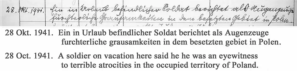 „Przebywający w okolicy na wakacjach żołnierz powiedział, że był świadkiem niebywałych potworności na terenach okupowanej Polski. Obserwował nagich Żydów – mężczyzn i kobiety – ustawianych przed długim głębokim rowem. Na rozkaz oficera SS wszyscy oni zostali zabici przez Ukraińców strzałem w tył głowy, po czym padali do rowu. Ten wypełniano potem ziemią, mimo że ze środka dochodziły okrzyki tych, którzy nadal żyli. Te akty okrucieństwa były tak nieludzkie, że część użytych jak narzędzia Ukraińców przechodziła załamanie nerwowe. Wszyscy żołnierze wiedzący o tak bestialskich poczynaniach nazistowskich podludzi wyrażali opinię, że naród niemiecki powinien trząść się jak galareta, gdyż niedługo nadejdzie czas zapłaty. Nie ma kary, która byłaby adekwatna dla tych nazistowskich potworów. Oczywiście, gdy nadejdzie już czas zapłaty, razem z winnymi będą musieli cierpieć niewinni. Z racji jednak na to, że obecnej sytuacji winne jest 99 procent ludności Niemiec, czy to pośrednio, czy bezpośrednio, można powiedzieć, że ci, którzy podróżują razem, razem zawisną.”