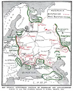 Usytuowanie frontów w czasie wojny domowej, marzec 1919 roku.