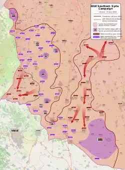 - ↑ Syrian Army launches major assault on rebel stronghold in northeast Daraa [online], Al-Masdar News, 22 czerwca 2018 [dostęp 2020-02-09] [zarchiwizowane z adresu 2019-05-01] (ang.).