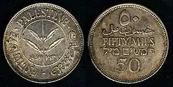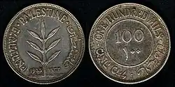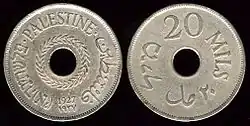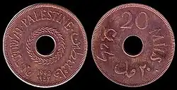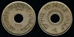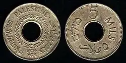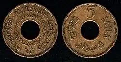 75% miedź, 25% nikiel | 6,5 g | 27 mm | Awers zawiera nazwę Palestyny w trzech językach: arabskim (فلسطين), angielskim (Palestine) i hebrajskim (פלשתינה א”י) i rok emisji. Rewers zawiera nominał w trzech językach: hebrajskim, angielskim i arabskim i wieniec wokół otworu. | ||