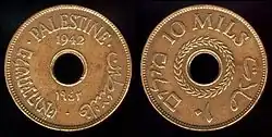 W kwietniu i maju 1942 roku Palestine Currency Board napotkała problemy z dostępnością niklu potrzebnego do wybicia monet o nominale 5, 10 i 20 milów (składały się one w 75% z miedzi i w 25% z niklu). Nikiel był wówczas wykorzystywany przez przemysł zbrojeniowy, co wymusiło zmianę składu stopu na brąz (97% miedzi, 2,5% cynku, 0,5% cyny). Nie był to jednak stop brązu identyczny do tego, który używany był do monet o nominale 1 mila i 2 mili z lat 1927–1941 (95,5% miedzi, 1,5% cynku, 3% cyny). Tym, co je odróżniało, był wybity otwór na środku monet 5, 10 i 20 milów[9].