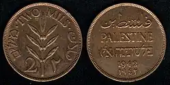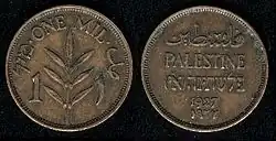1 listopada 1927 | 17 sierpnia 1948 | 95,5% miedź, 1,5% cynk, 3% cyna | 3,2 g | 21 mm | Awers zawiera nazwę Palestyny w trzech językach: arabskim (فلسطين), angielskim (Palestine) i hebrajskim (פלשתינה א”י) oraz rok emisji. Rewers zawiera nominał w trzech językach: hebrajskim, angielskim i arabskim oraz gałązkę oliwną. |