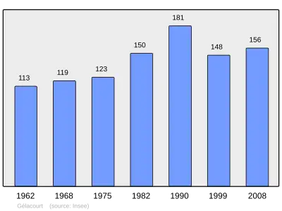Według danych na rok 1990 gminę zamieszkiwało 181 osób, a gęstość zaludnienia wynosiła 38 osób/km² (wśród 2335 gmin Lotaryngii Gélacourt plasuje się na 864. miejscu pod względem liczby ludności, natomiast pod względem powierzchni na miejscu 1032.).