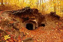 Na północnym zboczu wzgórza znajduje się wejście do wydrążonej w XVII wieku lodowni. Prowadzące do niej wejście wymurowane jest z drobnej żółtej cegiełki. Hala we wnętrzu wzgórza zbudowana jest z polnych kamieni. Obecnie wejście do niej jest zakratowane a sam obiekt zanieczyszczony warstwą liści[3].