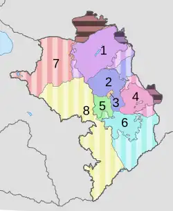 Republika Górskiego Karabachu do walk w 2020 roku[14] dzieliła się na 7 rejonów i stołeczne miasto Stepanakert (numery w zestawieniu odpowiadają tym, którymi rejony oznaczone są na mapie):